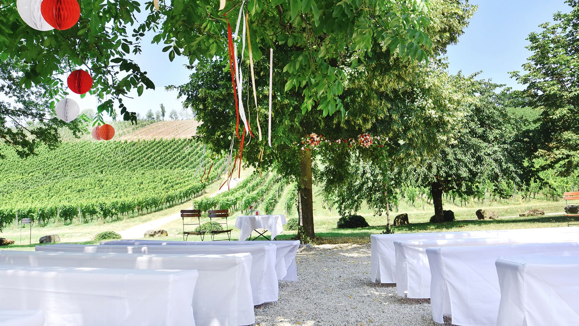• Wir liefern die gemieteten Hussen direkt in die Loca­tion, in der gefeiert wird.