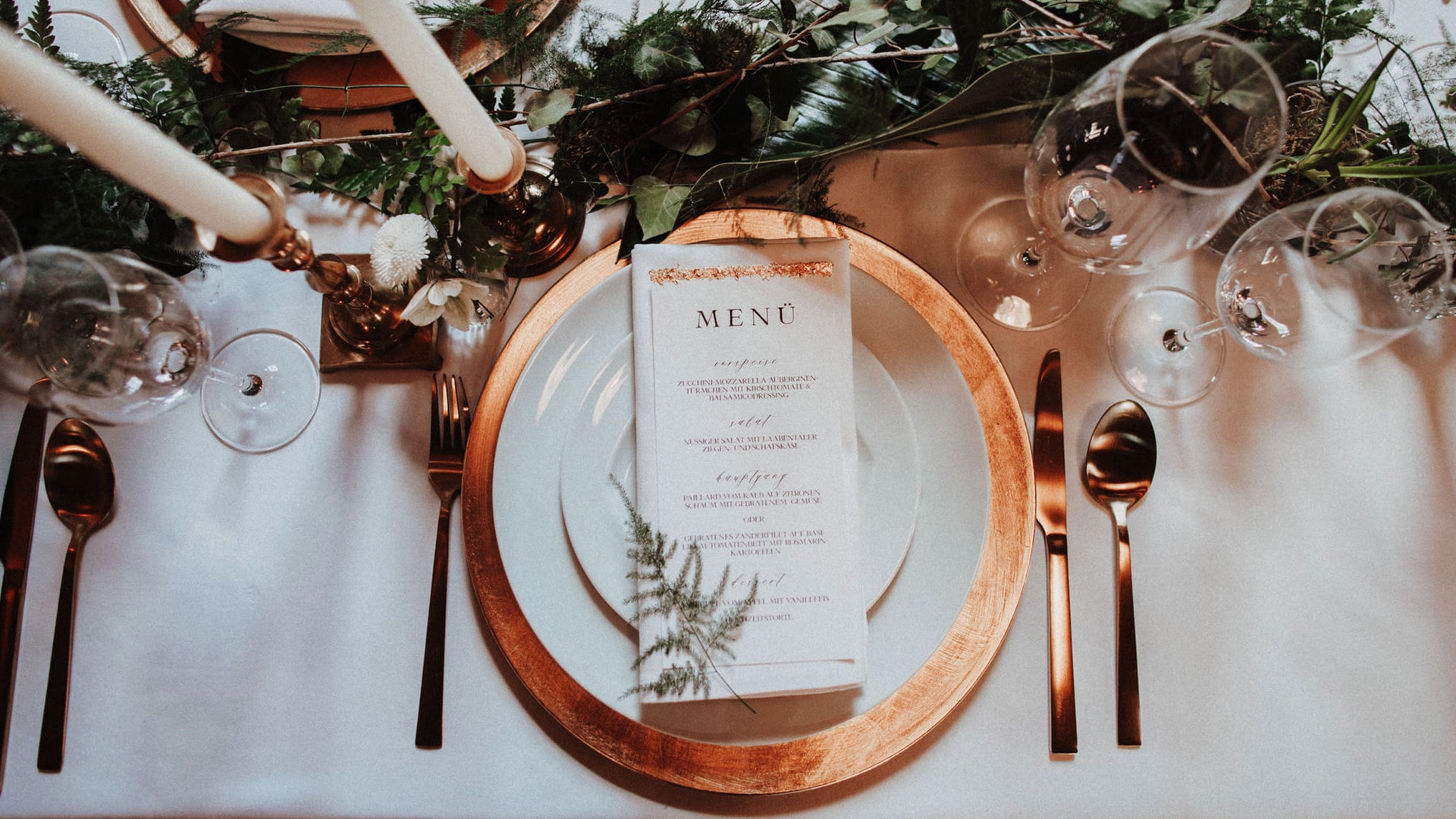 Stoffservietten dürfen auf einem festlich gedeckten Tisch nicht fehlen. Die Serviette liegt traditionell entweder direkt auf dem Teller oder rechts neben dem Besteck.